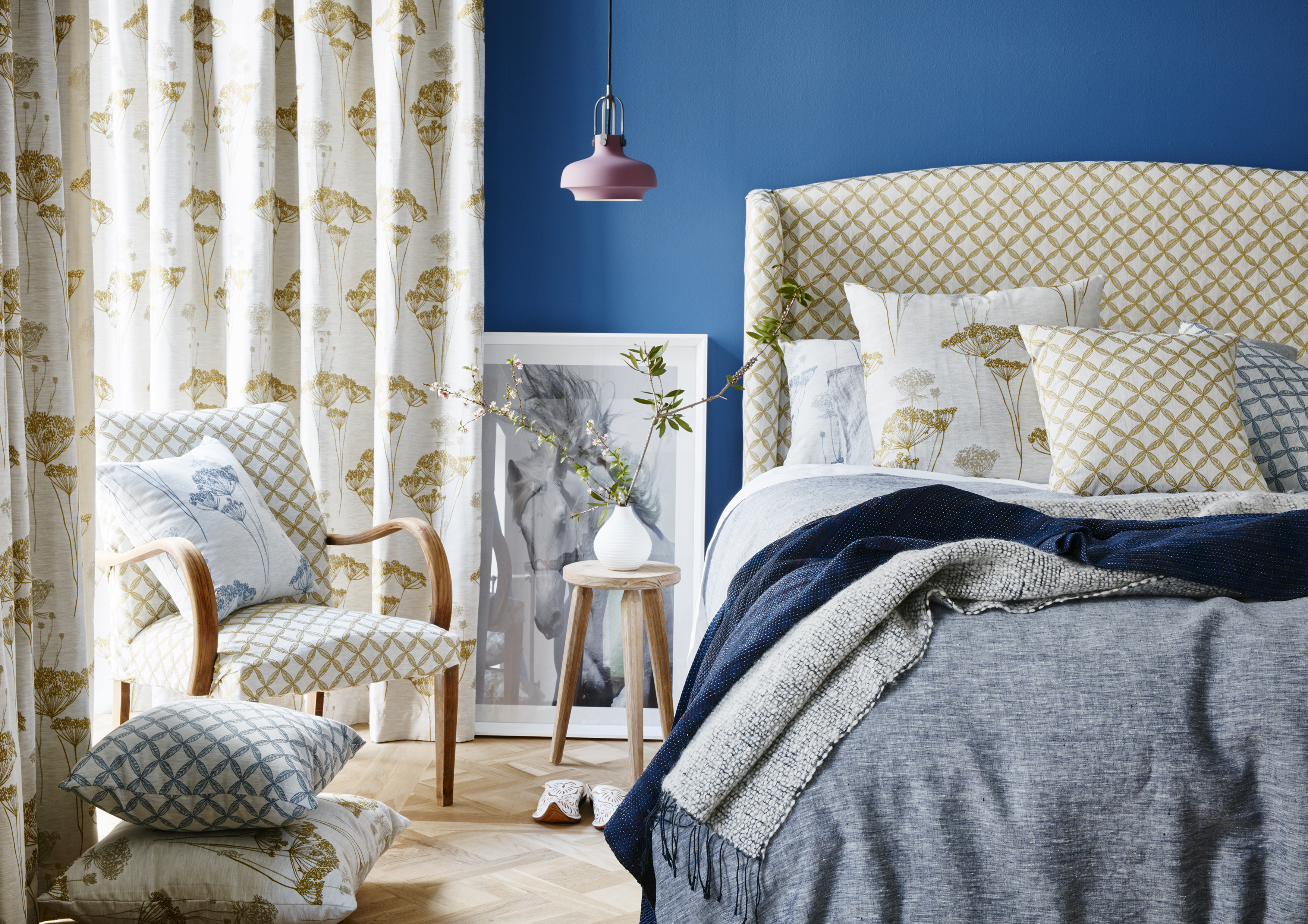If you want to give a classic feel to your bedroom, choose tactile fabrics constructed of natural fibres. Soft, muted pastels or classic neutral colours. To make a glamour statement, choose rich earthy or metallic colours, velvet fabrics or chenille’s.